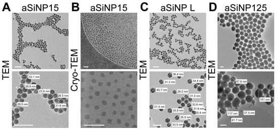 (Cryo-)transmission electron microscopy (TEM) and dynamic light scattering (DLS) measurements revealed the stable size of the used aSiNPs in a dry state as well as in solution (see Table S1). The hydrodynamic diameter remained constant, 33 nm for aSiNP15 and aSiNP L, or 125 nm for aSiNP125. Furthermore, all aSiNP retained a constant negative zeta potential in a serum-free cell culture medium, which can stabilize the suspensions via repulsive forces [38].