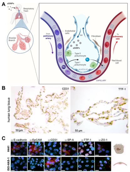 Figure 2. Biological model to mimic the alveolar-capillary barrier of the lung: (A) Illustration of a bronchial strain as the first protective cellular barrier against inhaled nanoparticle-containing air. (B) Light microscopic analysis of biomarker expression. Expression of CD31 and TTF-1 was analyzed in epithelial human lung tissue by immunohistochemistry with specific antibodies (brown). HE (hematoxylin/eosin) staining was applied to visualize tissue morphology (blue). CD31 surface marker was present on the membrane of epithelial cells in the human lung tissue, whereas TTF-1 was prominently expressed in cell nuclei. (C) Marker profiling of the H441 and ISO-HAS-1 dual cell line model was carried out by fluorescence microscopy after staining with specific antibodies (α-E-cadherin, α-EpCAM, α-CD31, α-SP-A, α-TTF-1, α-ZO-1) and the nuclear stain Hoechst-33342 (blue) to evaluate the cellular differentiation state. Scale bars, 10 µm. Respective cell types are symbolized by referring to (A). Created with BioRender.com.