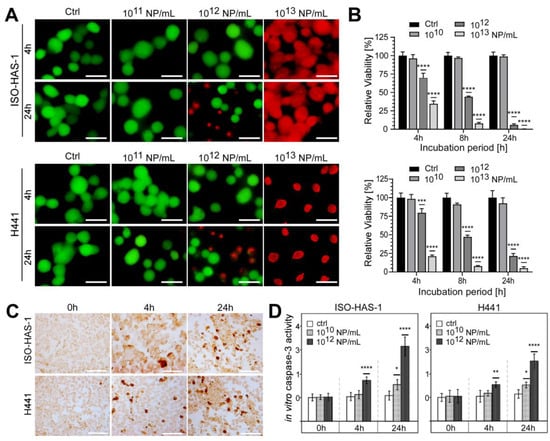 Figure 4. aSiNP15 treatment induced dose- and time-dependent toxicity on a dual alveolar-capillary barrier model. ISO-HAS-1 and H441 cells were treated with different particle concentrations in serum-free medium for 4 h; for later time points, treated cells were cultured for additional 20 h in serum-containing medium: (A) Live and dead staining analyzed by fluorescence microscopy. Green fluorescence marks viable cells; red fluorescence visualizes dead cells. (B) CellTiter-Glo™ Viability Assay. Data were normalized to untreated control samples for each time point. Unpaired t-test was used to compare treated cells to untreated control groups. Column, mean; bars, ±S.D. ***, p < 0.001, ****, p < 0.0001. (C,D) aSiNP15 induced apoptosis in ISO-HAS-1 and H441 cells via activation of caspase-3. (C) Light microscopic analysis of apoptosis marker caspase-3. Immunohistochemical staining of ISO-HAS-1 (upper panel) and H441 (lower panel) revealed expression of cleaved caspase-3 as a marker for apoptosis after 4 h of aSiNP15 treatment. Briefly, cells were treated with 1012 NP/mL for 4 or 24 h, fixed, stained for cleaved α-caspase-3, and visualized by light microscopy. Scale bars, 150 µm. (D) Quantification of in vitro caspase-3 activity confirmed time- and dose-dependent activation of apoptosis. Cleaved α-caspase-3 assay was performed with untreated and aSiNP15-treated cells. Cells were incubated for 4 h and 24 h with 1010 or 1012 NP/mL as indicated. Data were normalized to untreated control samples for each time point. Unpaired t-test was used to compare treated cells to untreated control groups. Column, mean; bars, ±S.D. *, p < 0.05, **, p < 0.01, ****, p < 0.0001.