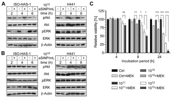 Figure 5. High concentrations of aSiNP15 attenuate PI3K/Akt and ERK signaling. (A,B) Activation of PI3K/Akt and ERK signaling pathways was analyzed by assessing the level of phosphorylated PI3K/Akt (pAkt) and ERK (pERK; Thr202/Tyr204) by immunoblot analysis. Whereas sub-toxic NP concentrations (1010 NP/mL) had no effect (B), pAkt and pERK decreased after incubation with 1012 NP/mL. ISO-HAS-1 and H441 were treated with 1012 NP/mL (A) or 1010 NP/mL (B) aSiNP15 (indicated by “+”), or in serum-deprived medium as control (indicated by “−“) for 2 h, 4 h, and 6 h. Proteins were detected by (phosphorylation-) specific antibodies, the respective non-phosphorylated proteins, and Actin served as loading controls. (C) Relevance of ERK signaling was confirmed by combined MEK (mitogen-activated protein kinase kinase) inhibitor treatment. After H441 cells were pre-treated for 2 h with or without the MEK inhibitor UO126 (10 µM), treatment with 1010, 1011, or 1012 NP/mL of type aSiNP15 was conducted for 4 h, 8 h and 24 h. Cell viability was measured via an MTT assay. Data were normalized for each time point to untreated controls. (*) Unpaired t-test was performed to compare MEK inhibitor-treated samples to samples with similar treatment without inhibitor. Columns, mean; bars, ±S.D. *, p < 0.05, **, p < 0.01, ***, p < 0.001, ns, not significant.