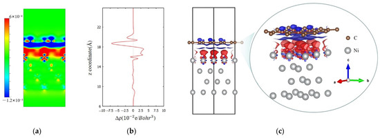 Figure 6 shows the 2D and 3D distributions of charge densities of a supercell at the graphene/Ni (111) interface as well as the planar-averaged electron density difference ∆ρ(z) along the z direction, presented in Figure 6a, c, and b, respectively. The dark blue area in Figure 6a,c represents the space where the electron density decreases at the composite interface compared to the single bulk before, while the red area represents an increase. This means that the electron density of the outer orbitals of the nickel atoms near the interface increases, while the electron density of the carbon atoms near the vacuum layer decreases. This suggests that the outer shell electrons around the carbon atoms are transferred to the adjacent outer orbitals of the nickel atoms, resulting in more empty orbitals around the carbon atoms at the interface. These empty orbitals make a trapping effect to retain the outgoing SEs in the surface. In addition, the charge redistribution mentioned above generates a sort of equivalent dipole layer within a local space, which weakens the internal SEE below this local space, ultimately leading to a decrease in the probability of SEE. Therefore, this calculation result reveals that the scheme of composite structure can suppress SEE. As for the outgoing SEs whose energy are enough to overcome the blocking effect and enter the spatial range of this equivalent dipole layer in the shallow surface, they are accelerated by the built-in electric field from the equivalent dipole itself, which naturally corresponds to a reduction in the work function.