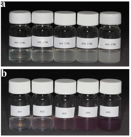 (a) Dental resin containing an increasing amount of bare silica nanoparticles without Irgacure 784 photoinitiator (Au1 CTRL, Au2 CTRL, Au3 CTRL, Au4 CTRL, and Au5 CTRL). (b) Dental resin containing an increasing amount of patchy nanoparticles without Irgacure 784 photoinitiator (Au1, Au2, Au3, Au4, and Au5).