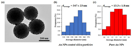 Representative TEM image of Au NPs-covered silica particles (a) with the size distribution diagram (b) and the size distribution diagram of pure Au NPs (c).