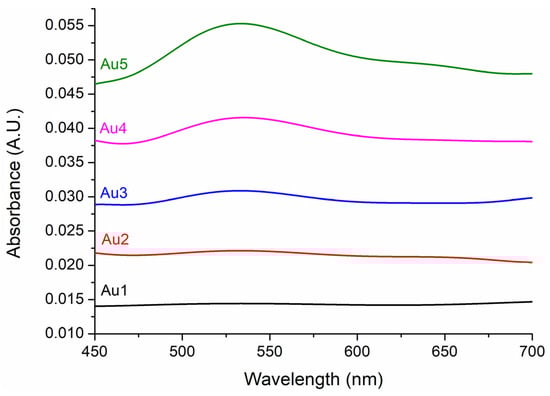 The UV-Vis spectrometry measurements revealed an LSPR peak between 532 and 535 nm. The intensity of the LSPR peak increased with increasing gold concentrations. At low gold concentrations, namely, Au1 and Au2, the SPR peak was barely visible.