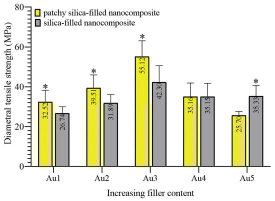 Mean diametral tensile strength data of patchy and bare silica-filled nanocomposites at five different filler concentrations (* significant differences compared to silica-filled, own control nanocomposite, p < 0.05).