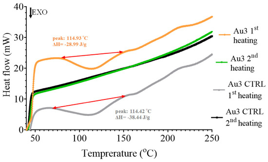The plasmon-enhanced polymerization in patchy silica-filled nanocomposite and bare light-induced polymerization in silica-filled control composite showed differences in the degree of conversion based on Raman measurements. Patchy-filled samples had significantly larger values of conversion than the ones without them (p < 0.05) (Table 3). DC was maximum in Au3 which contained 0.0208 wt% of Au (Table 2). The DC data were around 71–77%, which can be considered as a higher value than the unfilled dental resin matrix [12]. The possible explanation for the increase in DC in patchy-filled nanocomposite was the plasmon effect upon polymerization. There was a correlation between the DC-determined Raman spectroscopy measurements and differential scanning calorimetry (DSC) measurements. The measured DC showed the polymerization degree of the crosslinked polymer network after 532 nm irradiation. Pre-photopolymerized samples were analyzed [19,20] with the DSC measurements, which provided information about post-polymerization of unreacted monomers, and pendant vinyl groups and chains. The exothermic event of the first heating cycle of pre-polymerized samples indicated post-polymerization, as a highly cross-linked network was formed. The polymer network defects like loops, entanglements, and physical crosslinks determined the crosslink density, and thus, the physicochemical and mechanical properties of the composite [17]. The cyclization reduced DC and the reaction heat of post-polymerization. Tanimoto et al. found that increasing the amount of filler caused no difference in the DSC peak, which aligns with our results [21].