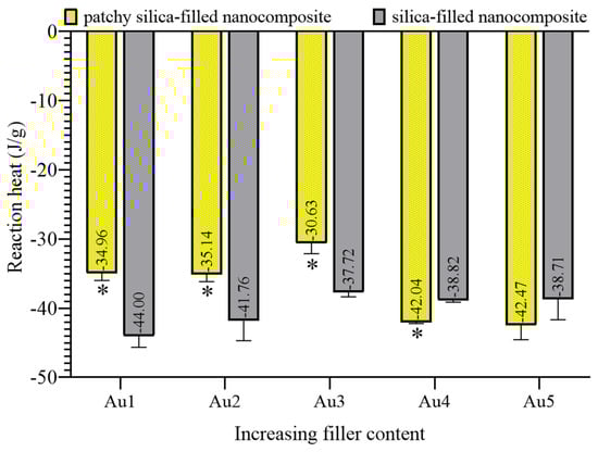 Mean exothermic reaction heat of patchy and silica-filled nanocomposites at five different filler concentrations (* significant differences compared to silica-filled, own control nanocomposite, p < 0.05).