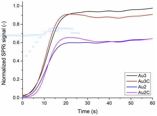 The refractive index change in the patchy silica-filled nanocomposite increased from Au1 to Au3, reaching a maximum in Au3. In Au4 and Au5, the refractive index decreased compared to Au3. In the silica-filled nanocomposite, a similar tendency was observed, and the maximum change was observed in Au3 CTRL. The refractive index change value of the control and patchy particles-filled nanocomposites is very close to each other; there are no significant differences between them, except in Au3, where the difference was obvious and significant (p = 0.0013). For each sample, values in Au3 was significantly higher than the others. Au2 with Au4, and Au1 with Au5 showed similarities. In Figure 7, the representative SPRi kinetic curves are presented for Au2 and Au3 and their controls. The normalized SPRi signals reached the maximum value at around 40 s. In Au2 and its control, the signal showed similar values at 40 s. In Au3, the SPRi signal presented a higher value than its control at the end of light illumination.