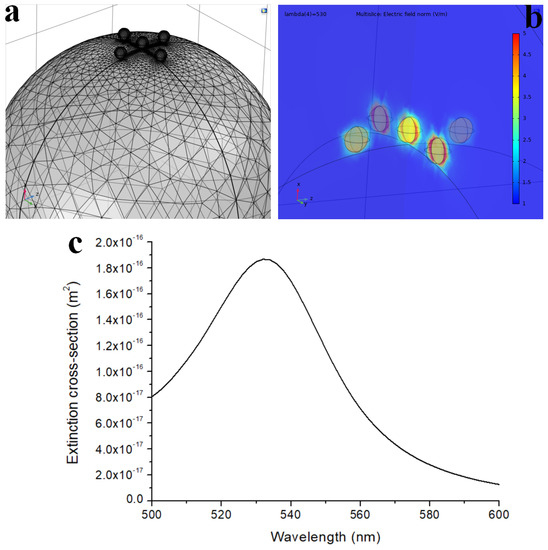 FEM model of the patchy nanoparticles. (a) The constructed 3D model and mesh. (b) The resulting electric field maps around the nanoparticles. (c) The resulting extinction spectrum with the LSPR peak at 532 nm.