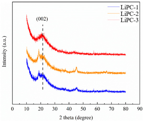 The morphology of the LiPC-3 was presented using SEM images. Figure 1a displays the surface of the LiPC-3 with honeycomb-like features when the magnification scale was set to 2 μm. Figure 1b shows the randomly distributed sheet-like disordered microstructures of LiPC-3 when the magnification scale was set to 500 nm. X-ray diffraction analysis was performed on the LiPC-1, LiPC-2, and LiPC-3 samples, as shown in Figure 2. It can be observed that the common feature for different amounts of alkali metal Li doping is the broad peak at 2θ = 23°, which represents the (002) diffraction plane and indicates a partial graphitization degree of the porous carbon [24]. Additionally, the peaks of Li derivatives in the XRD pattern were not very prominent, indicating a good dispersion of Li in the porous carbon.