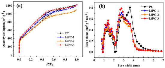 Figure 3 displays the N2 adsorption–desorption isotherms of all samples at 77 K. The N2 adsorption isotherm of the PC sample sharply increased with a relative pressure of P/P0 = 0.01, indicating the presence of micropores. It is worth noting that the isotherm of PC shows an increasing N2 adsorption with increasing relative pressure in the range of P/P0 = 0.01–0.5, along with a small hysteresis loop, indicating the presence of mesopores. After Li doping, there was no significant change in the N2 adsorption isotherm. As shown in Figure 3b, the pore size distribution mainly fell within two similar ranges: 1–2 nm and 2–5 nm. With the introduction of Li, the peak at 1–2 nm increased and the peak at 2–5 nm shifted to the right, indicating that Li doping could enhance the micropore volume and reduce the size of narrow mesopores in the porous carbon. As shown in Table 2, PC exhibited a high specific surface area and total pore volume of 2268 m2 g−1 and 1.716 cm3 g−1, respectively. The specific surface area of Li-doped porous carbon increased from 2268 m2 g−1 to 2678 m2 g−1, representing a 14% increase. However, the total pore volume decreased from 1.716 cm3 g−1 to 1.688 cm3 g−1. This is mainly due to the fact that LiPC-3 showed the highest micropore volume of 0.535 cm3 g−1, which was a 32% increase compared to PC. These results were mainly attributed to the activation of porous carbon by LiOH, leading to an increase in micropore volume, while the activation or pyrolysis process caused the collapse of mesopores, resulting in a decrease in mesopores.
