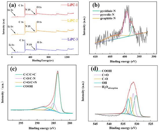 The types and quantities of elements in the samples were measured using X-ray photoelectron spectroscopy (XPS). The spectrum of LiPC-3 only showed four main peaks, corresponding to C 1s, N 1s, O 1s and Li 1s (Figure 4a). As shown in Figure 4b, the N1s peak was divided into pyridinic-N (398.4 ± 0.2), pyrrolic-N (399.8 ± 0.2), and graphitic-N (400.7 ± 0.2). Pyrrolic-N was the main nitrogen functional group in all samples [25,26]. As shown in Figure 4c, the C 1s peak was divided into C-C/C=C (286.2 eV), C-O/C-N (287.4 eV), and C=O/C=N (289.0 eV) [27]. Figure 3d shows the O 1s peak divided into five peaks at 532.1 eV (COOH), 531.9 eV (C=O), 532.8 eV (C-O), 533.4 eV (OH), and 535 eV (H2O adsorption) [8,28]. With the increase in Li proportion, the nitrogen content decreased while the oxygen content increased (Table 2).