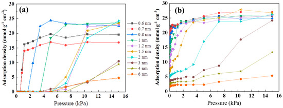 The effect of pore size and nitrogen/oxygen groups on methanol adsorption at 25 °C, as simulated by GCMC, is showed in Figure 6. As shown in Figure 6a, the methanol adsorption isotherm was similar to the water adsorption isotherm on porous carbon [40]. At 15 kPa, compared to the pore size range of 0.8–2 nm, there was a slight decrease in methanol adsorption in the pore size range of 0.6–0.7 nm. This was mainly because methanol molecules adsorbed as a monolayer in the 0.6–0.7 nm slit pore model, while there was multilayer filling adsorption in the 0.8–2 nm range. When the pore size exceeded 2 nm, the methanol adsorption sharply decreased at 15 kPa. It is worth noting that the adsorption capacity of the 6 nm pore size can be neglected compared to the 0.6 nm pore size. This could be attributed to inadequate methanol–methanol interactions in the slit pore model, which cannot support the adsorption of methanol molecules in wider pores [10,41]. To gain a better understanding of the impact of the slit pore model on methanol adsorption at low pressures, a threshold pressure was introduced. This threshold pressure represents the pressure at which the adsorbate begins to be adsorbed by the adsorbent. As the pore size increased from 0.7 nm to 6 nm, the threshold pressure increased from 0.8 kPa to 5 kPa. Additionally, the saturated adsorption capacities at 1 kPa for pores of 0.6 nm and 0.7 nm were 16 mmol g−1 and 14 mmol g−1, respectively. For pores of 0.8–2 nm, the threshold pressure to reach the saturated adsorption capacity was 3–10 kPa. However, for pores of 3–6 nm, the saturated adsorption capacity was not reached even at 15 kPa. This indicates that smaller pore sizes are advantageous for adsorbing methanol at low pressures. As shown in Figure 6b, Li doping can reduce the threshold pressure of methanol. This is primarily attributed to the increased polarity of the carbon framework surface due to the doping of Li atoms, which enables strong interactions with the OH groups in methanol. At 15 kPa, compared to pure graphite (2 nm), the pore size for filling adsorption in the slit pore model increased to 3 nm after Li doping, and the adsorption capacity in the 4–6 nm pores was also improved. In addition, at 15 kPa, the methanol adsorption capacity was also increased by 10–20%. Therefore, Li doping not only improved the adsorption performance of methanol at low pressures, but also at relatively high pressures, which was different from the results of nitrogen- and oxygen-doped porous carbons in previous works in the literature.
