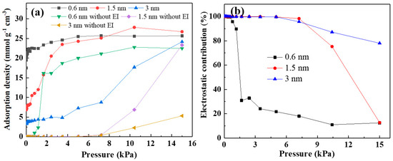 Furthermore, GCMC simulations were performed with and without electrostatic interactions between the carbon framework and methanol molecules. The adsorption capacity of porous carbon with and without electrostatic interactions for methanol is shown in Figure 8a. As shown in Figure 8, electrostatic interactions could lower the threshold pressure for methanol adsorption in the slit pore model, thereby providing a larger adsorption capacity at relatively low pressures. At relatively high pressures, electrostatic interactions could also increase the adsorption performance of methanol, increasing it by about 15% in the slit pores around 0.6 and 1.5 nm. In the 3 nm slit pore, the electrostatic effect generated by the Li-doped slit hole model increased the adsorption capacity of methanol by 357% compared with the undoped one. Additionally, we examined the influence of Li-doped porous carbon on methanol adsorption properties by estimating the electrostatic contribution using Equation (1).