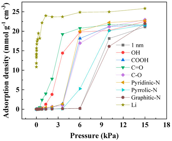 The isotherm effects of lithium-, nitrogen-, and oxygen-doped narrow pores on methanol adsorption are illustrated in Figure 9. At relatively low pressure, nitrogen and oxygen doping could reduce the threshold pressure for methanol adsorption and increase the adsorption capacity of methanol, while the saturated adsorption capacity of methanol showed no significant difference. The adsorption capacity of methanol at 15 kPa ranged from 21.9 to 22.9 mmol g−1, which was 3.8–8.5% higher than that of undoped methanol (21.1 mmol g−1). This indicates that nitrogen and oxygen groups have limited influence on the adsorption capacity of methanol under relatively high pressure, but can enhance the adsorption capacity of methanol under relatively low pressure. The lithium-doped slit pores reached saturation at 1 kPa, while the saturation pressures for nitrogen and oxygen doping were both above 2.5 kPa, which mainly meant that the slit pore models produced by lithium doping had stronger surface polarity than those of doped nitrogen and oxygen. Additionally, the saturated adsorption amount of lithium-doped narrow pores increased by approximately 10–25% compared to nitrogen and oxygen doping. This was mainly due to the higher surface polarity of the lithium-modified porous carbon compared to nitrogen and oxygen modifications.