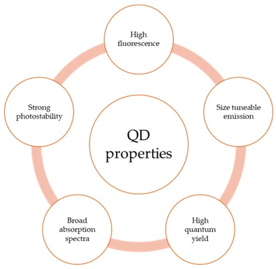The unique electronic properties of QDs result from the particle size and shape, which can be manipulated for diagnostic purposes. When a QD is excited by an energy photon hv (the absorption of light), electrons from the valence band (lower energy level) jump to the conduction band (a higher energy level), resulting in an electron–hole pair called an “exciton”. As they return to the lowest energy state (ground state), electrons and holes recombine and release energy or light in the form of single photons [44,45]. The crystal’s size, composition, and shape determine the wavelength (color) of light that will be released [46]. The larger size QDs emit orange or red wavelengths, while smaller QDs emit shorter blue or green wavelengths. Consequently, the specific tuning of these optical properties (how the QD absorbs and emits energy) can be manipulated to produce distinctive colors by changing the size and shape of the dot [47].