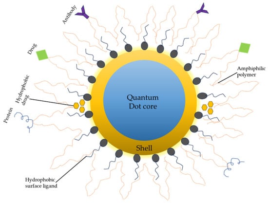 Surface functionalization of QD core/shell. The surface coating (e.g., amphiphilic polymer coating) enables antibodies, drugs, proteins, and other compounds to be linked with it. Hydrophobic drugs can also be integrated between the hydrophobic core and amphiphilic layer.