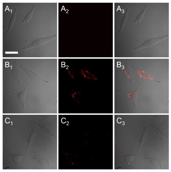 Confocal fluorescence images of HeLa cells (A) before and (B) after mixing with CdTe/CdS QDs at 5 µg/mL and (C) 30 µM of Cu2+ was then added to (B) to monitor concentration change of Cu2+ Showing as (1) brightfield images, (2) fluorescence images (700–800 nm filter), and (3) merging of (1) and (2). (Scale bar 30 µm. Reprinted with permission from [181]).