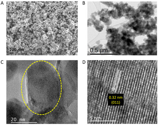 Furthermore, mostly spherical and aggregated nanoparticles with an average particle size smaller than 100 nm are imaged by SEM in Figure 3A for the annealed VO2. Such nanoparticles are promising because they could possess different properties than the bulk size of the same materials [54]. The particle measurements were checked by their TEM images. Low-resolution and high-resolution TEM images are captured in Figure 3B–D. The morphology of nearly spherical nanoparticles with an average aggregate size of about 40 nm is indicated by the circle in Figure 3C. In addition, Figure 3D shows that the interplanar distance was measured as 0.32 nm, which is related to the (011) crystal plane. This is in agreement with the XRD spectra and d-spacing value. Similar TEM results were published in a scientific paper by our team [17].