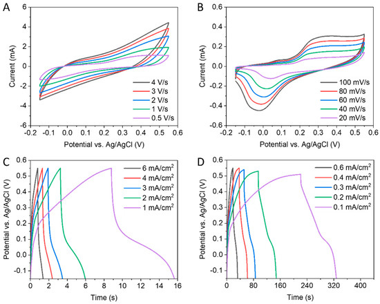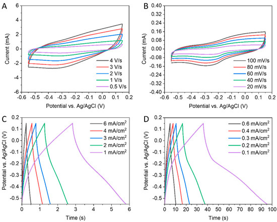 Electrochemical performance of VO2/Au hybrid electrodes from −0.15 to 0.55 V: (A,B) CV curves. (C,D) GCD curves.