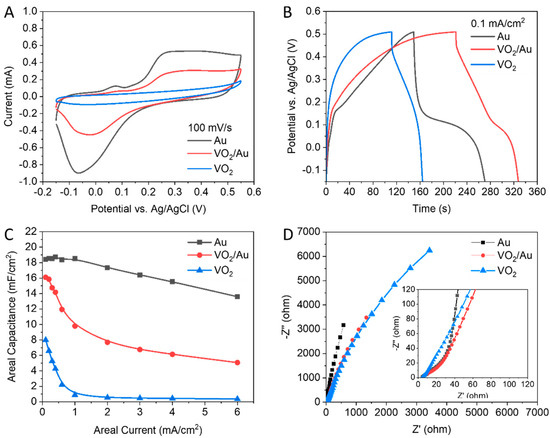 Comparisons of hybrid VO2/Au electrodes and their individual components from −0.15 to 0.55 V. (A) CV curves. (B) GCD curves. (C) Areal capacitance functions. (D) Nyquist plot of EIS with an enlarged scale.