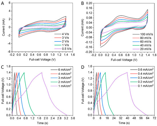 Before making the full-cell, it is suggested to examine the half-cell of the VO2 electrode in the negative potential window. In Figure 6A,B, the CV curves indicate that there are oxidation and reduction peaks. In addition, a good redox reversibility is implied by the small and stable potential displacement between the peaks. Consequently, the time of charging and discharging processes in Figure 6C,D suggests that the VO2 electrode works on the negative voltage side with better electrochemical performance than on the positive side abovementioned in Figure S1C,D. At 0.1 mA cm−2, the VO2 electrode shows a slightly higher 8.5 mF cm−2 areal capacitance than that of VO2 in the positive range (8.0 mF cm−2).