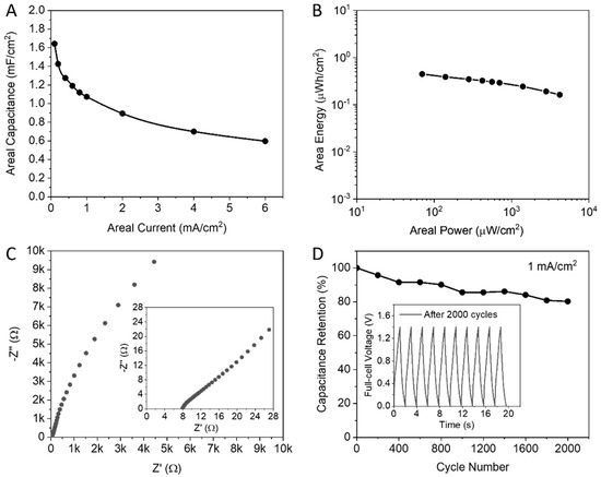We calculated the areal capacitance according to the GCD curves, 1.642 mF cm−2 was recorded at 0.1 mA cm−2, as pointed in Figure 8A. Additionally, the areal energy values of this supercapacitor are calculated from the areal capacitances and operating voltage (Equation (2)), then the areal power values are calculated using Equation (3) and plotted in Figure 8B. The device delivers areal energy of 0.447 μWh cm−2 at an areal power of 70 μW cm−2. Moreover, the full-cell has around 7.9 Ω of equivalent series resistances (Figure 8C). Figure 8D shows that 80% of the capacitance is retained after 2000 GCD cycles at 1 mA cm−2. In comparison, the area, energy, and power of this VO2//Au asymmetric supercapacitor are superior than that published for symmetric VO2 microparticles, which are 0.2 μWh cm−2 at 17.5 μW cm−2 [30]. A maximum areal energy of 0.68 μWh cm−2 at an areal power of 95 μW cm−2 is recorded by Velmurugan et al. [31] using a V2O5 symmetric supercapacitor with PVA-KOH. Nevertheless, their V2O5 samples were fabricated by physical vapor deposition with vacuum coating units, which is a complex and costly preparation method. The printing techniques used in our study are recommended for simple, time-saving, and cost-effective fabrication methods.