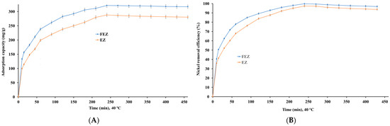 - In the third stage (240–460 min), metal adsorption exhibits a plateau trend, indicating saturation of the active sites, after reaching equilibrium. The data suggest that the optimal time necessary for the adsorption process to reach equilibrium for each of the adsorbents is 240 min.