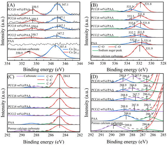 XPS profiles of Ca 2p (A), O 1s (B), and C 1s (C) and their magnified binding energies from 292–285 eV (D) for porous calcium carbonate, PAA, and PCC/PAA with 2–8 wt% porous calcium carbonate.