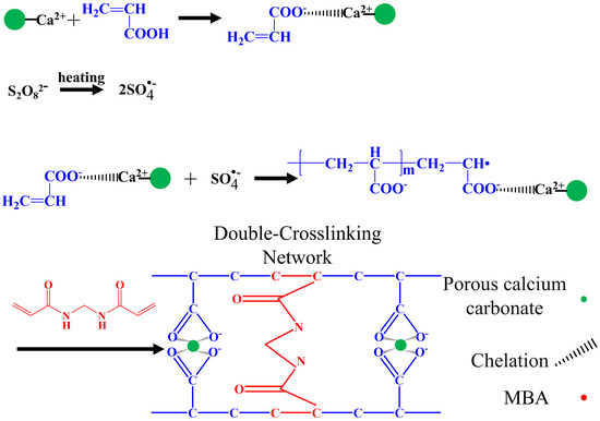 Figure 5 shows the crosslinking mechanism of the porous calcium carbonate with the polymeric chain. First, the –COO− in the acrylic acid chelated with Ca2+ on the surface of the porous calcium carbonate. Second, the persulfate produced sulfate anion radicals under heating, which were assigned to the acrylic acid monomer and formed polyacrylic acid by multidirectional grafting polymerization on the porous calcium carbonate surface [55]. Finally, during the polymerization of the linear polyacrylic acid molecules, the chemical crosslinker MBA formed a crosslinking network between the growing polyacrylic acid chains through the terminal vinyl group, and the porous calcium carbonate chelated with the –COO− group in the polyacrylic acid chain through Ca2+, which also participated in the crosslinking of polyacrylic acid chains. The PCC/PAA had a double-crosslinked network structure constructed by the porous calcium carbonate and MBA.