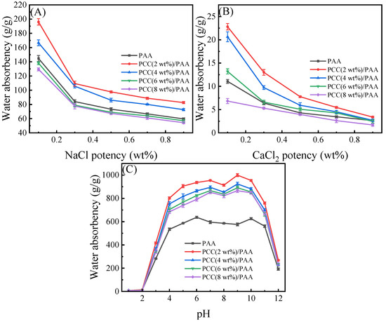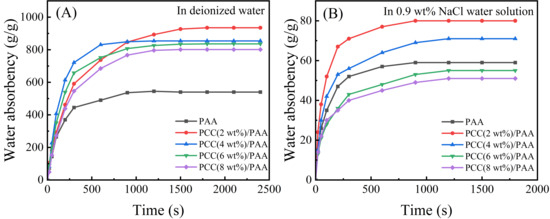 Figure 6A shows the water absorbency of the PAA and PCC/PAA with 2–8 wt% porous calcium carbonate in deionized water. Adding porous calcium carbonate can improve the water absorbency of the PCC/PAA, reaching 935 g/g for PCC (2 wt%)/PAA, which is higher than the 395 g/g for PAA. According to the FT-IR and XPS analysis, the reason was the crosslinking of the porous calcium carbonate with the polyacrylic chains. The entanglement between the polymer chains within the PCC/PAA weakened due to the crosslinking of the porous calcium carbonate, which resulted in more water storage space within the PCC/PAA and increased water absorbency [63]. In addition, acrylic acid can be grafted and copolymerized in multiple directions on the porous calcium carbonate surface due to the Ca2+ crosslink point, which makes the porous calcium carbonate act as a multidirectional crosslinking point inside the PCC/PAA. Polymer chains can carry tensile forces in multiple directions, so the crosslinked network of PCC/PAA is more flexible and can freely expand to improve the water absorbency. However, when the content of porous calcium carbonate increased from 2 wt% to 8 wt%, the water absorbency of the PCC/PAA decreased from 935 g/g to 801 g/g. With the increase in the content of porous calcium carbonate, on the one hand, the crosslinking points increased during the polymerization of the PCC/PAA, and the polyacrylic acid chain length that constituted the crosslinking network became shorter, which limited the free expansion of the crosslinking network. On the other hand, the relative content of the hydrophilic –COOH group in the crosslinked network decreased, and the water absorbency decreased. In addition, the absorption rate of the PCC/PAA increased with increasing porous calcium carbonate content in the first 900 s. The absorption rate was the fastest when the content of porous calcium carbonate reached 4 wt%, reaching saturation after 600 s in deionized water. According to the SEM images of the PCC/PAA, the PCC (4 wt%)PAA is rich in pores, which increases the contact area with water and, therefore, has the fastest absorption rate [64]. The above results indicated that the water absorbency of the PCC/PAA improved by the involvement of the porous calcium carbonate in the crosslinking of polyacrylic chains in the PCC/PAA.