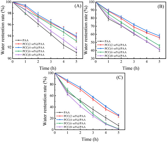 The water-retention rate at 20 °C (A), 40 °C (B), and 60 °C (C) of PAA and PCC/PAA with 2–8 wt% porous calcium carbonate.