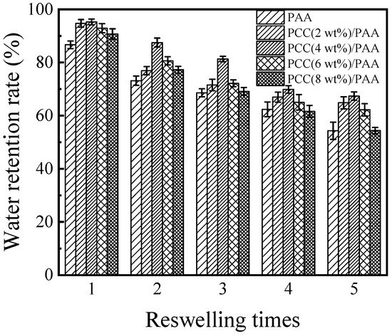 To evaluate the reswelling water absorbency of the PAA and PCC/PAA, consecutive swelling–deswelling cycles were carried out in deionized water at pH = 7 and 25 °C. The dry superabsorbent sample was immersed in excess deionized water to achieve swelling equilibrium. The swollen sample was dried in an oven at 60 °C and immersed again in excess deionized water to achieve swelling equilibrium. The loss of reswelling water absorbency of the superabsorbent is recorded in Figure 9. The results showed that the reswelling water absorbency of the PAA and PCC/PAA decreased with increasing reswelling time, which was due to the decomposition of weak crosslinking points in the crosslink network [71]. After five reswellings, the water absorbency of the PAA was only 54% of the first water absorbency. The reswelling water absorbency of the PCC/PAA significantly improved by adding porous calcium carbonate. The water absorbency of the PCC (4 wt%)/PAA achieved 67% of the initial water absorbency when it underwent five reswellings. Combining the results of FT-IR, XRD, and XPS, it is clear that the improved reswelling water absorbency of the PCC/PAA was due to the double-crosslinked network structure of the PCC/PAA constructed by porous calcium carbonate with MBA, which enabled the crosslinked network of PCC/PAA to undergo multiple reswelling water absorbencies without breaking [72]. However, as the content of the porous calcium carbonate increased from 4 wt% to 8 wt%, the reswelling water absorbency of the PCC/PAA decreased continuously. After five reswellings, the water absorbency of the PCC (8 wt%)/PAA was only 54% of the initial water absorbency. The decrease in reswelling water absorbency was attributed to the porous calcium carbonate as the crosslinking site of the polyacrylic acid chain. With increasing content, the crosslinking sites increased, which reduced the length of the polyacrylic acid chain and the flexibility of the crosslinking network [73], making the crosslinking network of the PCC/PAA easily destroyed in the process of reswelling water absorbency.