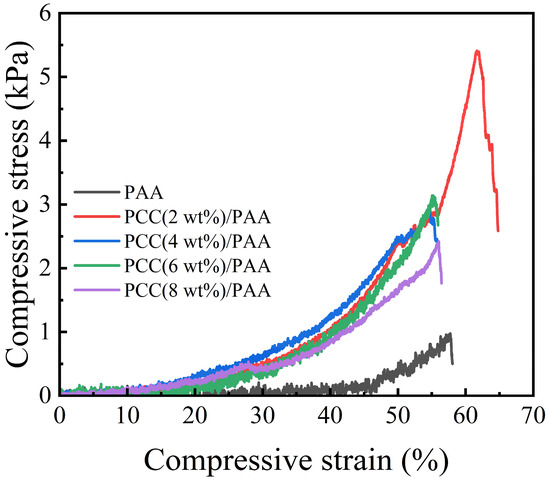 Compressive stress of PAA and PCC/PAA with 2–8 wt% porous calcium carbonate.