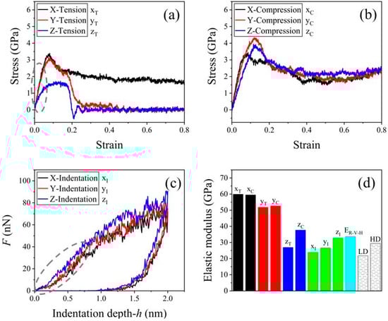 3.1. Elasticity Obtained by Indentation and Uniaxial Simulation