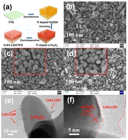 The surface modification of hematite with oxygen evolution cocatalysts (OECs) has been demonstrated as an effective approach to address the issues mentioned above [9,10,11]. Layered double hydroxides (LDHs), which contain edge-sharing octahedral MO6 units, are ideal candidates due to their unique layered structure and compositional versatility. Previous work has reported on introduced LDHs, such as NiFe-LDHs [12], NiCe-LDHs [13], ZnCo-LDHs [14] and CoAl-LDHs [15], onto hematite photoanodes to enhance PEC performance. Among the LDHs, CoFe-LDHs have attracted research interest for (photo)electrocatalytic water oxidation due to the synergistic effect of Fe and Co, which can enhance OER activity [16,17,18]. Xu et al. [19] reported on engineering interfaces to steer hole dynamics in BiVO4 photoanodes for solar water oxidation. CoFe-LDHs were decorated on the surface of a BiVO4/Co3O4 photoanode using cathodic electrodeposition, demonstrating further enhancement in PEC performance. However, an undesirable interface between the semiconductor and LDHs cocatalyst can have a detrimental effect on PEC water oxidation.