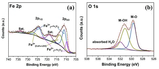 To further confirm the electrodeposition of CoFe-LDH on the surface of the TFO, the XPS analysis of the CoFe-LDH/TFO samples was conducted to determine the surface elemental composition and chemical state. The high-resolution XPS spectra of Fe 2p, O1s, Co 2p and Ti 2p are presented in Figure 2a–d. As shown in Figure 2a, in the Fe 2p XPS spectrum, the binding energies of 711.0 eV and 724.5 eV correspond to the peaks of Fe 2p3/2 and Fe 2p1/2, respectively. Followed by fitting deconvolution, the two peaks at 713.3 eV and 727.2 eV are assigned to the Fe3+ in CoFe-LDH, the two peaks of lower binding energy centered at 711.1 eV and 724.3 eV represent the Fe3+ in α-Fe2O3, and the other two peaks at 709.7 eV and 722.4 eV are assigned to the Fe2+ of α-Fe2O3 [29,30]. Additionally, the observable Fe3+ satellite peaks at 718.7 eV and 733.8 eV are consistent with the presence of Fe3+ in α-Fe2O3 and CoFe-LDH [31,32]. The O1s peaks of the CoFe-LDH/TFO samples can be deconvoluted into three peaks, as seen in Figure 2b. The binding energies centered at 529.8 eV, 531.3 eV and 532.2 eV can be assigned to the lattice oxygen species in hematite, the hydroxyl groups of CoFe-LDH and the absorbed H2O, respectively [33]. In Figure 2c, the Co 2p XPS spectrum shows two major peaks at binding energies of Co 2p3/2 and Co 2p1/2, accompanying two satellite peaks located at 787.5 eV and 803.1 eV. After further fitting of the Co 2p3/2 and Co 2p1/2, the binding energies at 781.0 eV and 797.2 eV can be attributed to the Co2+ in CoFe-LDH [34]. Moreover, the Ti 2p XPS spectrum of the CoFe-LDH/TFO samples is presented in Figure 2d. The peaks at 458.2eV and 464.1eV correspond to the Ti4+ 2p3/2 and Ti4+ 2p1/2 peaks, respectively, indicating the presence of Ti4+ in the TFO [23]. The observation of the Ti 2p XPS spectra confirms the successful doping of Ti, which is consistent with the results of the DRS UV–Vis analysis.