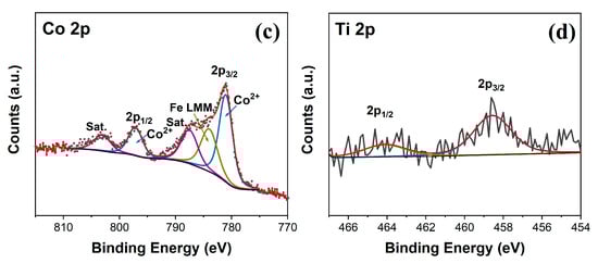 High-resolution XPS spectra of (a) Fe 2p; (b) O 1s; (c) Co 2p and (d) Ti 2p in the CoFe-LDH/TFO samples.