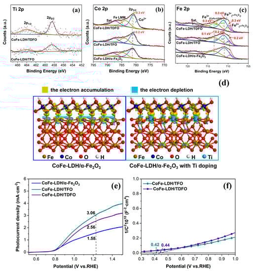 It has been discussed and proven that surface modification with CoFe-LDH enhances the charge separation and transfer efficiencies of TFO. The remarkably enhanced photocurrent density observed after CoFe-LDH deposition can be attributed to several factors. Firstly, the good optical transparency (Figure S1d) of CoFe-LDH reduces light absorption losses in the photoanodes, facilitating the formation of more photogenerated holes and electrons [19,43]. Additionally, we found the presence of an interfacial coupling between CoFe-LDH and α-Fe2O3. In order to study the effect of Ti doping on the CoFe-LDH/α-Fe2O3 photoanodes, we prepared CoFe-LDH/TFO with a double amount of Ti doping (denoted as CoFe-LDH/TDFO) using the same synthesis method as for CoFe-LDH/TFO (the Ti 2p XPS spectra of CoFe-LDH/TFO and CoFe-LDH/TDFO are exhibited in Figure 5a). The high-resolution Co 2p and Fe 2p XPS spectra of CoFe-LDH/α-Fe2O3 and CoFe-LDH/TDFO were investigated, as shown in Figure 5b,c, and the corresponding peak fitting results were similar to those of CoFe-LDH/TFO [29,30,34]. However, in the XPS spectra of Co 2p3/2 in Figure 5b, we observed noticeable negative shifts of 0.13 eV for CoFe-LDH/TFO and 0.28 eV for CoFe-LDH/TDFO compared to CoFe-LDH/α-Fe2O3. With increased Ti doping, these negative shifts became more pronounced. Furthermore, in Figure 5c, we observed that the Fe 2p3/2 peaks of α-Fe2O3 shifted towards higher binding energy with increasing Ti doping, while the Fe 2p3/2 peaks of CoFe-LDH shifted towards lower binding energy. These observations indicate the presence of the interface coupling effect between CoFe-LDH and α-Fe2O3 with Ti doping [44]. Notably, stronger coupling was observed with increased Ti doping, resulting in a partial electron transfer from α-Fe2O3 to CoFe-LDH, which explains the observed shifts [45].