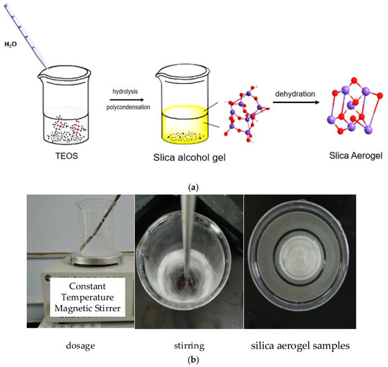 The silica aerogel samples were prepared quickly and conveniently at room temperature and pressure using ethyl orthosilicate (TEOS) as the silica source and anhydrous ethanol (EtOH) as the solvent. Ethyl orthosilicate and anhydrous ethanol were added to the beaker and stirred well using a magnetic stirrer. A certain amount of distilled water was added, and dilute hydrochloric acid was added dropwise to adjust the pH to the range of 3–5; then, the solution was further stirred for 30 min, and the stirred solution was placed in a thermostatic water bath with a preset temperature of 40 °C and left to stand for more than 20 min. The solution after acid hydrolysis was placed on a constant temperature magnetic stirrer, to which dimethylformamide was added dropwise and then stirred for 30 min; then distilled water was added and stirred for 30 min, and the pH was adjusted to between 8 and 10 by adding diluted ammonia dropwise to the resulting solution and stirring for 30 min to make it fully react. The stirred solution was poured into a beaker and left to stand for 2 h at room temperature, at which time the silica alcohol gel was obtained.