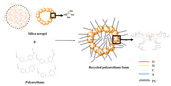 Since silica aerogel contains some silicon hydroxyl groups on its surface when the hydroxyl group of the polyol reacts with the isocyanate group in the IPDI, some of the silicon hydroxyl groups of silica aerogel will replace the hydroxyl group of the polyol and combine with the isocyanate group to form the carbamate group, which becomes the skeleton part of polyurethane foam. The silica aerogel that does not contain the hydroxyl groups is incorporated into the regenerated polyurethane foam and becomes a physical reinforcing agent. The reaction mechanism is shown in Figure 3.
