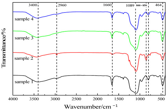 The component silica aerogel specimens were tested and analyzed via infrared spectroscopy using Spectrum-one (American PE Co., Ltd, Denver, CO, USA) and the result is shown in Figure 4. The sample preparation methods are listed in Table 1. It can be seen from the figure that the vibration peak of the Si-O-Si group in the silica aerogel molecule appears near 1089 cm−1, and this peak is more acute, and there are obvious peaks at 464 cm−1 and 800–850 cm−1, which are the bending vibration peaks of the Si-O-Si group and symmetric stretching vibration peaks [37,38], indicating that the products contain a large amount of the Si-O-Si bond; the absorption peaks appearing near 3400 cm−1 are -OH group vibration peaks, indicating the presence of a certain amount of -OH groups in the specimens. In summary, the main components of the prepared specimens were all silica aerogels.