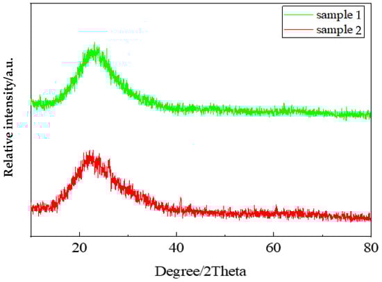 The prepared silica aerogels were tested and analyzed using an X-ray diffraction analyzer (Empyrean, Malvern Panaco Co., Ltd, Amsterdam, The Netherlands). The test radiation tube had a voltage of 40 kV, a current of 180 mA, a scanning range of 5–90°, and a speed of 3.5°/min. The silica aerogel is mainly composed of silica, and it can be seen from Figure 5 that both silica aerogel sample 1 and silica aerogel sample 2 have the same diffuse diffraction peaks, indicating that both the self-prepared silica aerogel and commercial silica aerogel are disordered amorphous bodies dominated by silica [39].