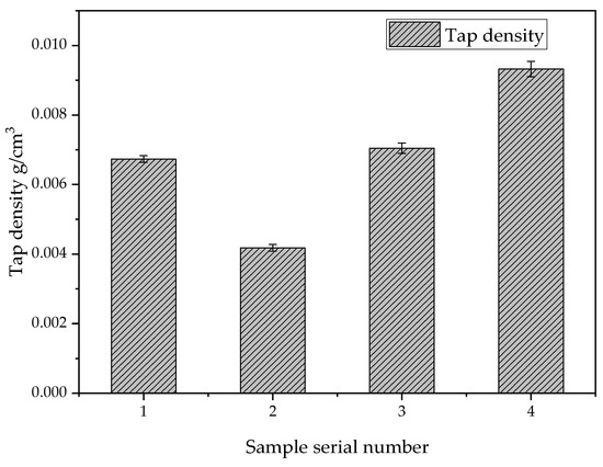 Using a vibration density meter to measure the density of silica aerogel powder, a certain amount of specimen powder was put into the measuring cylinder, the cylinder was fixed on the vibration device, it was vibrated for 12 min, and we obtained the result that the volume of the specimen after the vibration no longer changed. According to the formula ρ = m/V, one can obtain the density of silica aerogel powder. Figure 7 shows that the vibration density of the silica aerogels prepared using different ethyl orthosilicate and anhydrous ethanol concentrations is slightly different. Therefore, the best ratio consists of 30 g of ethyl orthosilicate, 45 g of anhydrous ethanol, and 5 g of distilled water, which has the smallest vibration density of 0.0043 g/cm3.