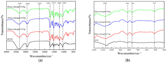 Infrared spectra of recycled polyurethane foam with different silica aerogel additions: (a) 4000–400 cm−1; (b) 1200–400 cm−1.