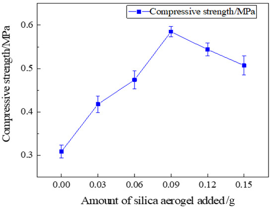 The compressive strength of the specimen was tested using a universal material testing machine, and the silica aerogel-regenerated polyurethane composite foam with different silica aerogel additions was made into a 50 × 50 × 50 mm specimen block and measured at a displacement speed of 20 mm/min; multiple identical samples were repeated, and the average value was taken. The test results are shown in Figure 11.