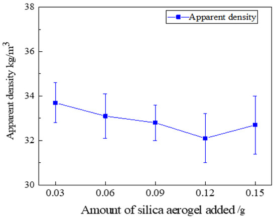 The specimens of silica aerogel-regenerated polyurethane nanocomposites with different additions of silica aerogel were left in a cool place (25 °C) for 72 h, and then the regenerated polyurethane specimens were cut into 50 × 50 × 50 mm specimen blocks to test their apparent density, and the specimen blocks were weighed using an electronic balance to calculate the apparent density of the specimens according to the formula ρ = m/V. The experiment was repeated five times for each group of formulations and the average value was taken; the measurement results are shown in Figure 12.