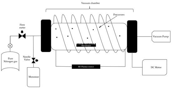 In the study conducted by Noresah et al. [35], they report the functionalization of an ultrafiltration membrane by depositing two monomers onto the membrane surface under vacuum conditions. A cylindrical quartz vacuum chamber measuring 30 cm in length and 6 cm in diameter was used as the reactor. The UF membrane sample (Dimensions: 6 cm × 15 cm) was placed on flat silicon wafers before being transferred to the chamber. A copper coil antenna connected to a 13.56 MHz radiofrequency plasma generator was positioned through the quartz window of the chamber. Firstly, a vacuum condition was created inside the chamber by turning on the vacuum pump to remove the air from the reactor. The monomer 2-hydroxyethyl methacrylate was vaporized in a stainless steel flask before being delivered to the vacuum chamber by controlling the fine metering valve. A back cooling plate was installed as a substrate support to maintain the membrane temperature. The chamber’s desired operating pressure (<100 mtorr) was maintained using a proportional integral derivative-controlled butterfly valve connected to a capacitance manometer. The optimized flow rate and power of acrylic acid plasma (0.75 sccm; 40 W) and the deposition of 2-hydroxyethyl methacrylate (0.4 sccm; 50 W) were used throughout the modification process.