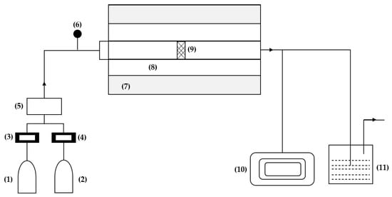 Experimental deposition system: (1) argon, (2) propylene, (3) flow meter, (4) manometer, (5) mixing cylinder, (6) manometer, (7) furnace, (8) graphite reaction chamber, (9) carbon layer, (10) vacuum pump, (11) off-gas treatment device. Reinterpreted from [37].