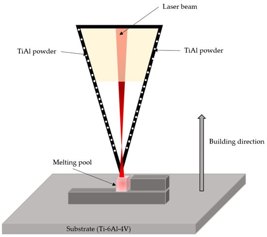 This technique is mainly based on a fiber laser with a power of ~6000 W that irradiates the substrate while directing the powder of the desired doping material, including metal, ceramic and polymer substrates. Figure 6 shows the laser metal deposition (LMD) process diagram. This technique provides high precision and a rapid deposition rate [48].
